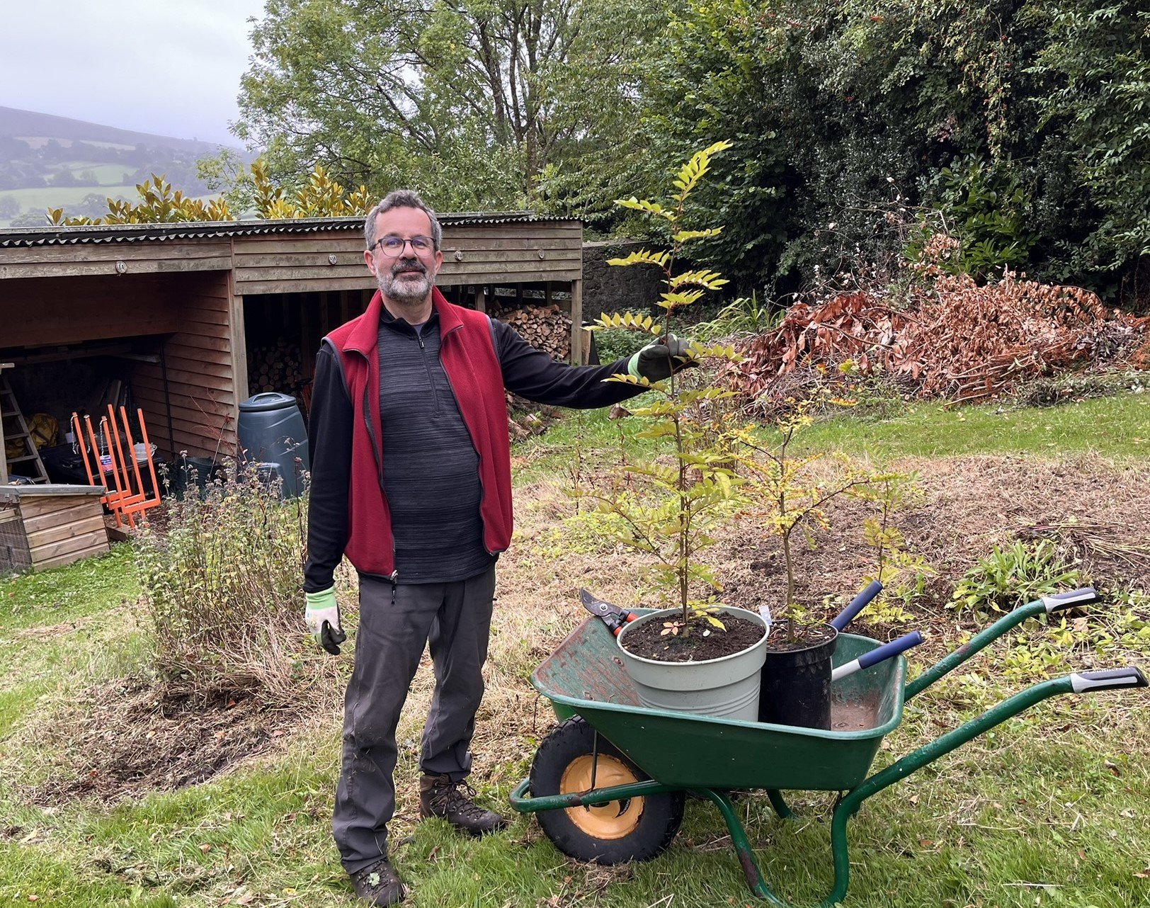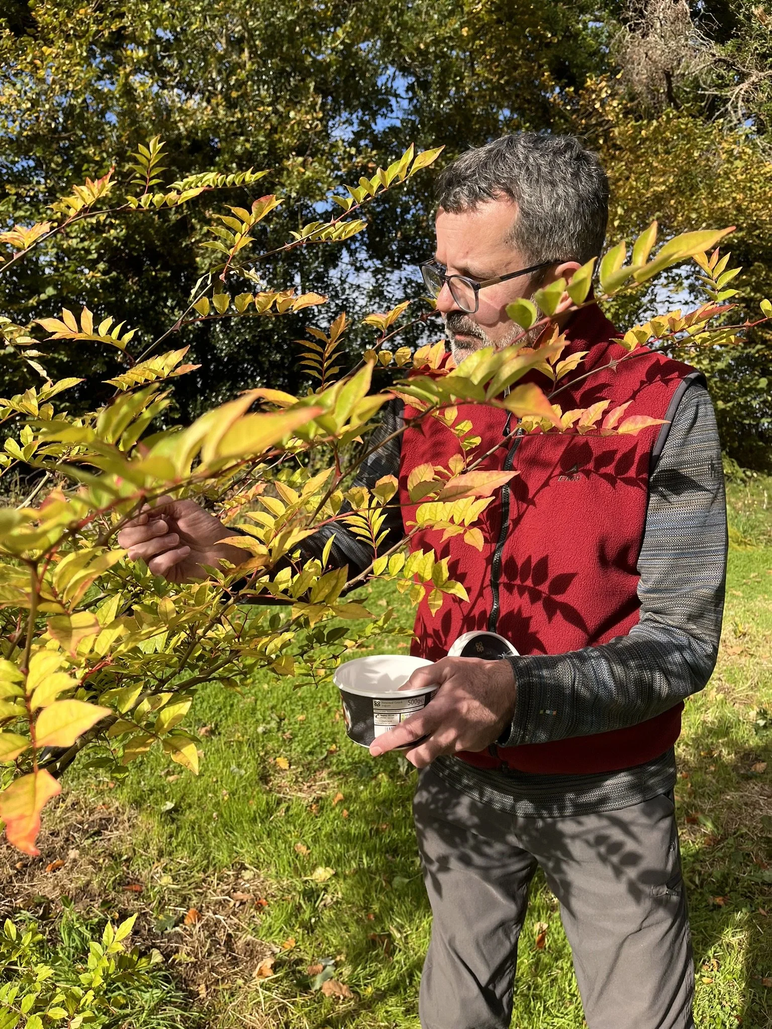Even more excitingly, Jon has found that it is surprisingly easy to grow new Szechuan pepper plants from those discarded seed kernels. In 2022, he experimented with different ways to treat the seeds to aid germination: leaving them in lemon juice overnight (to mimic a bird’s acidic stomach) then putting them in the freezer for a week or so before potting in an unheated greenhouse to overwinter (Szechuan pepper seeds need frost to germinate). Jon grew on the resulting seedlings in pots for two years, repotting regularly through each growing season, and in October 2025 he planted the two strongest specimens near the original mother plant in the orchard. Hopefully in a few years these will also be providing us with generous crops of tangy berries.
